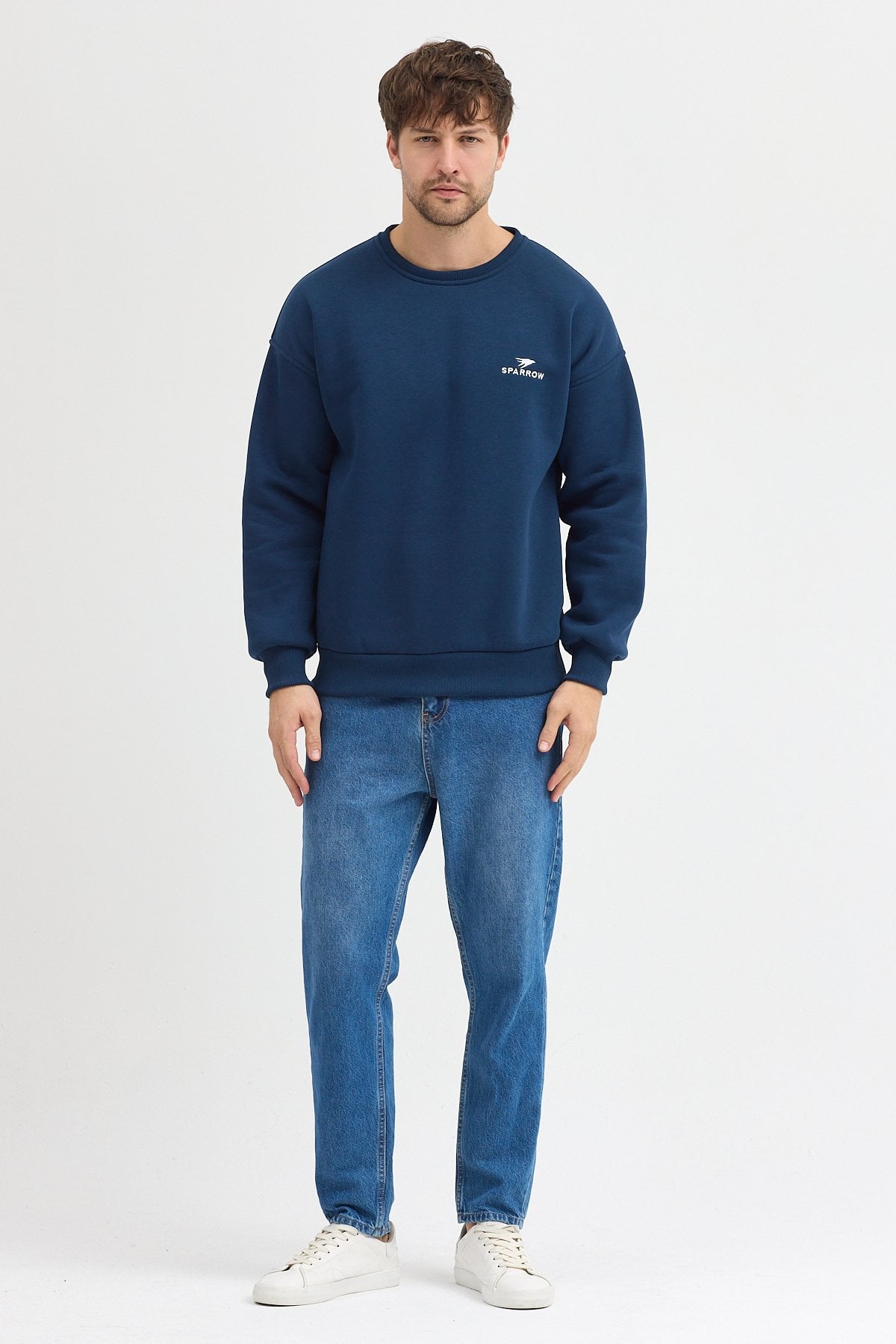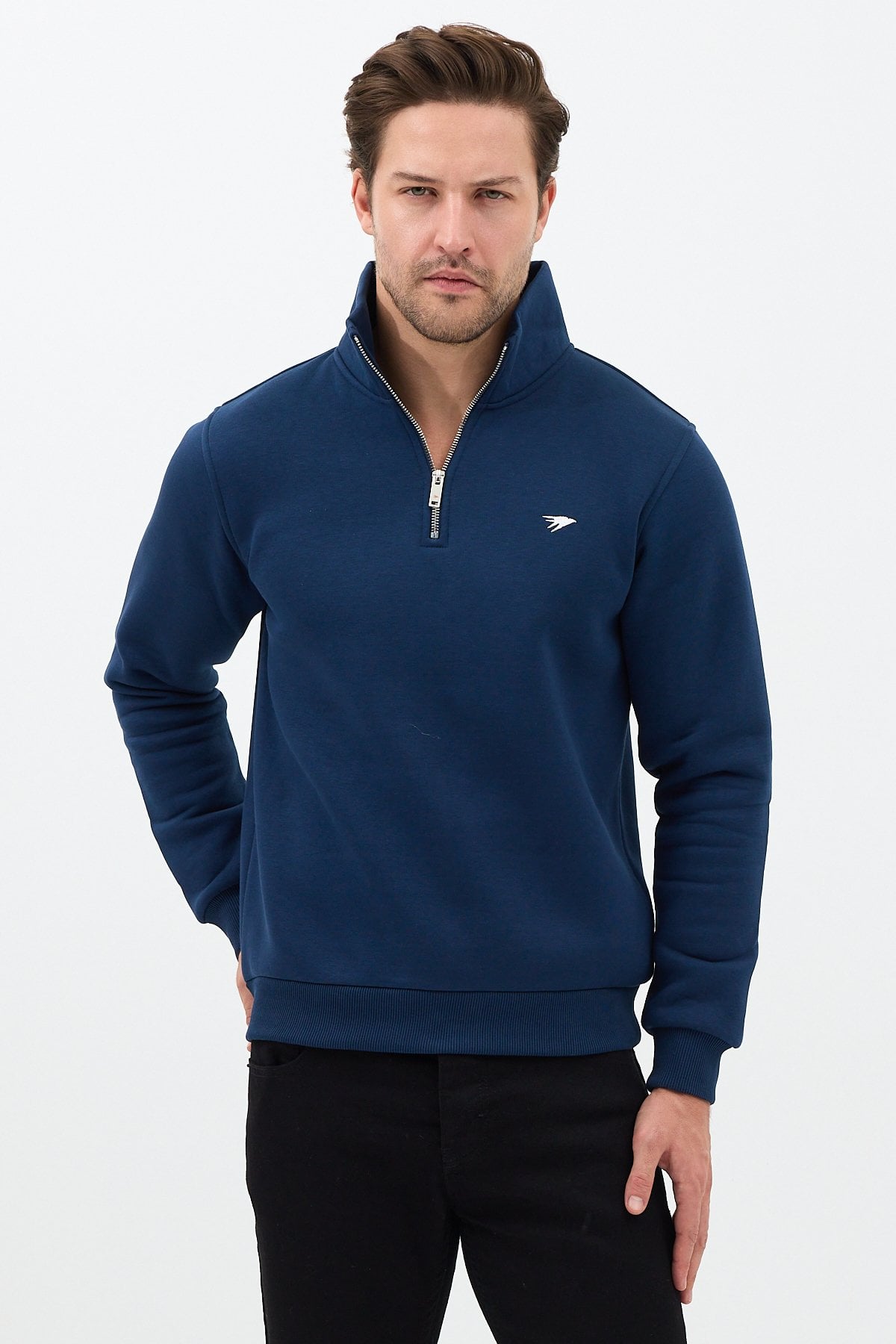 Regular Fit Dik Yaka Pamuklu Unisex Yarım Fermuarlı Nakışlı Sweatshirt Lacivert - S