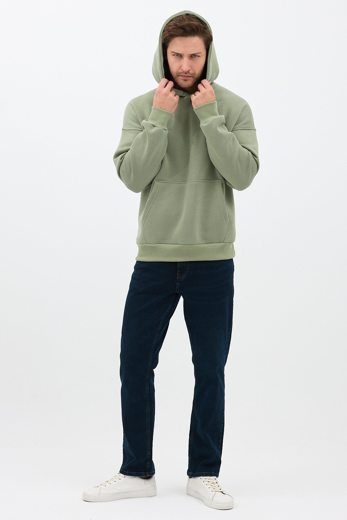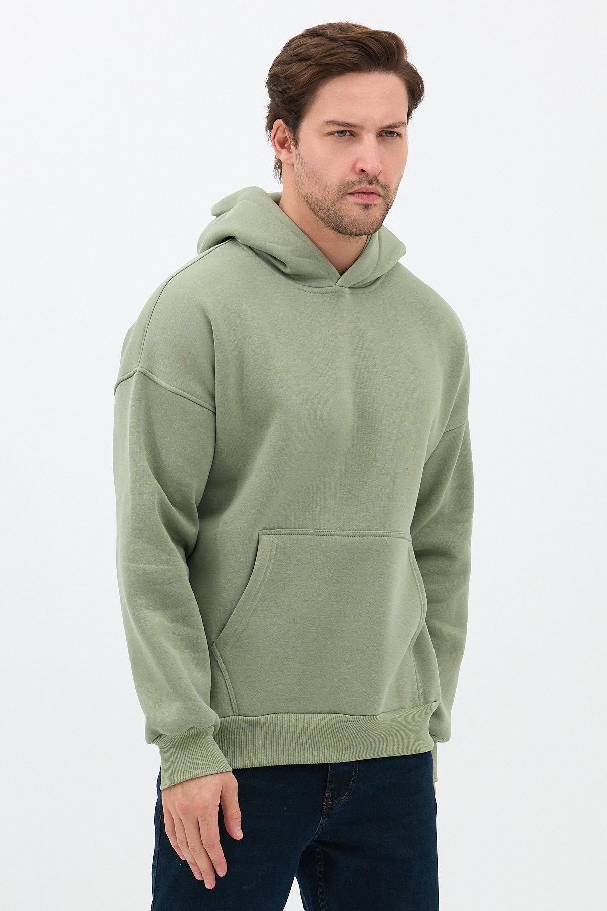 Erkek Oversize Pamuklu Kanguru Cepli 3 İplik Basic Kapüşonlu Sweatshirt Buz Yeşil - M SPRW-K-YESIL-M