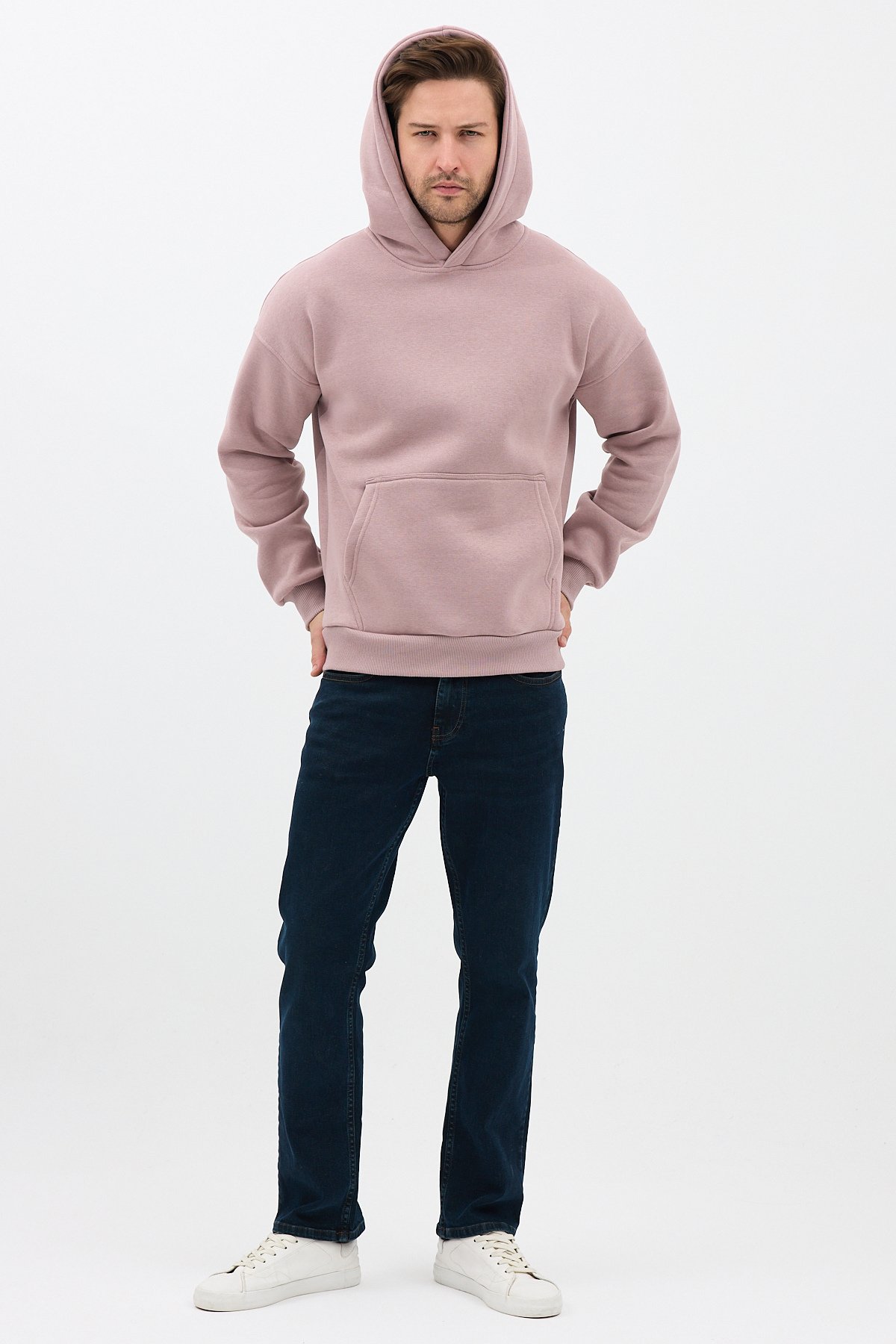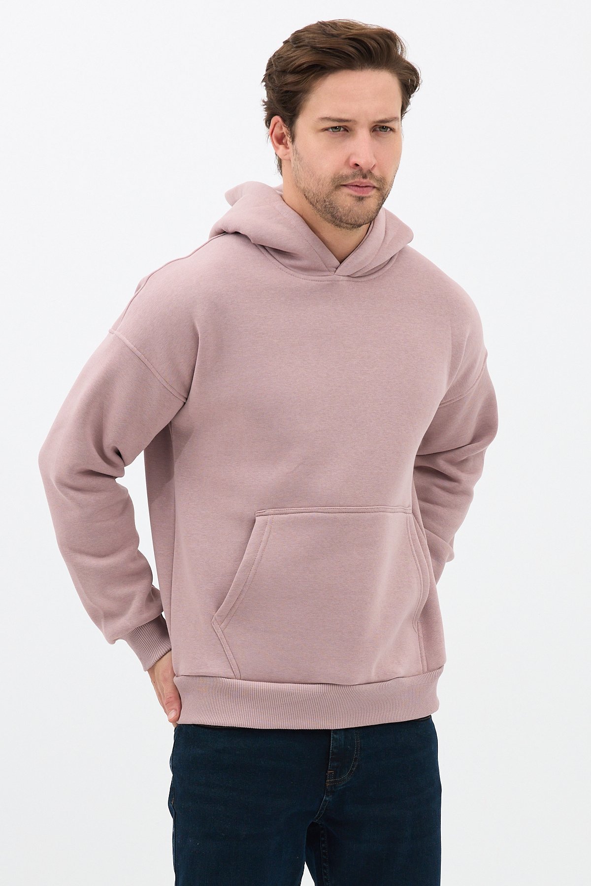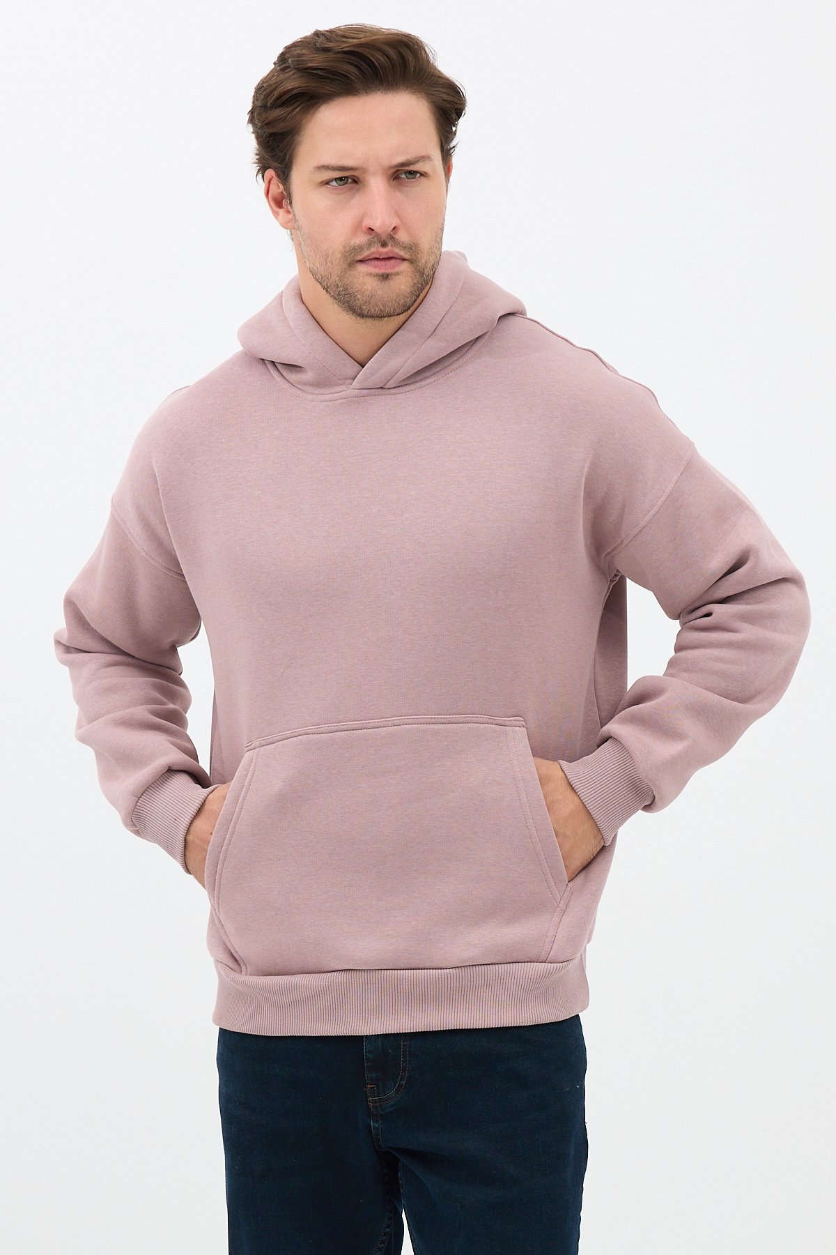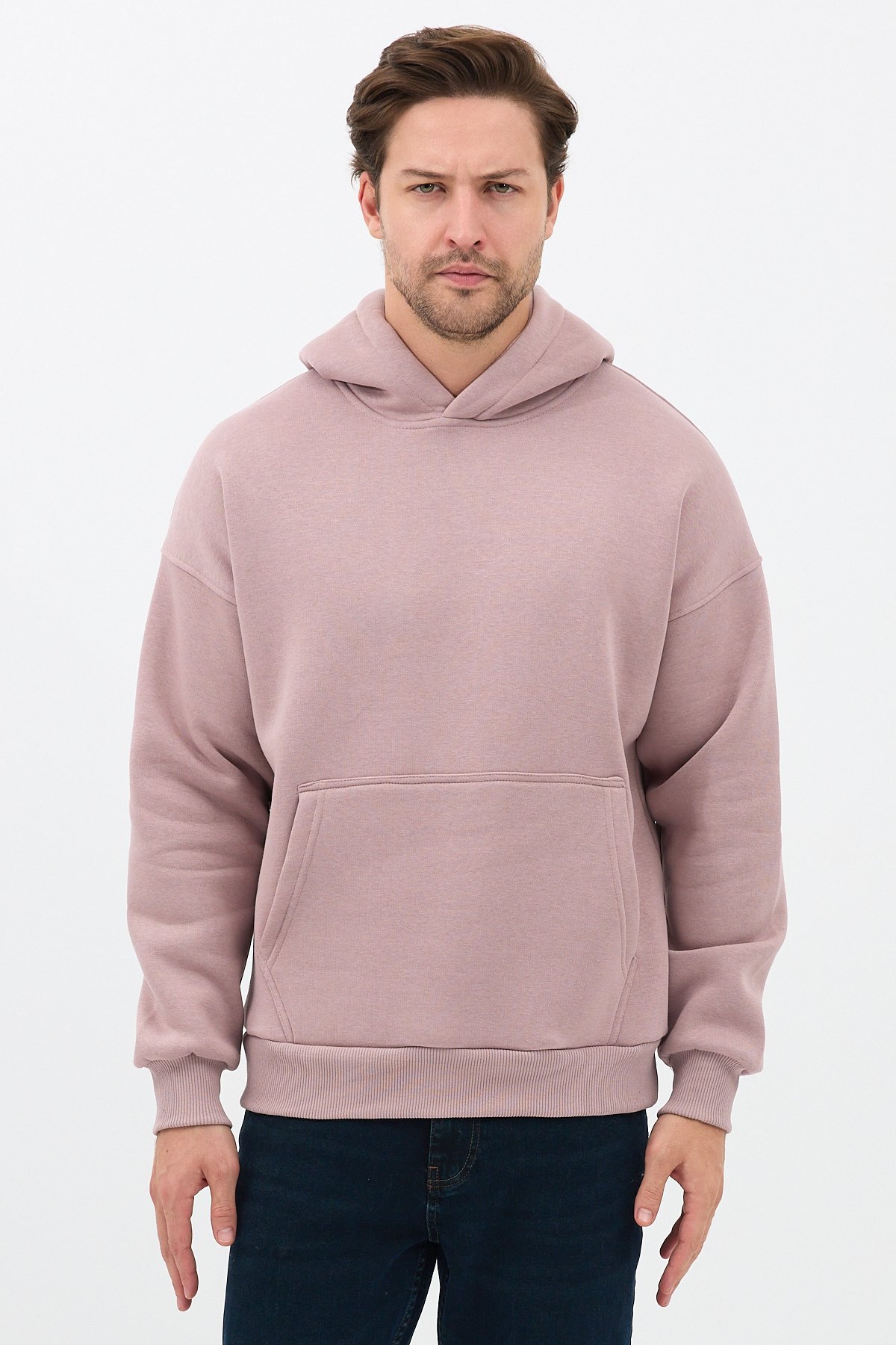 Erkek Oversize Pamuklu Kanguru Cepli 3 İplik Basic Kapüşonlu Sweatshirt Buzmenekşe - XL