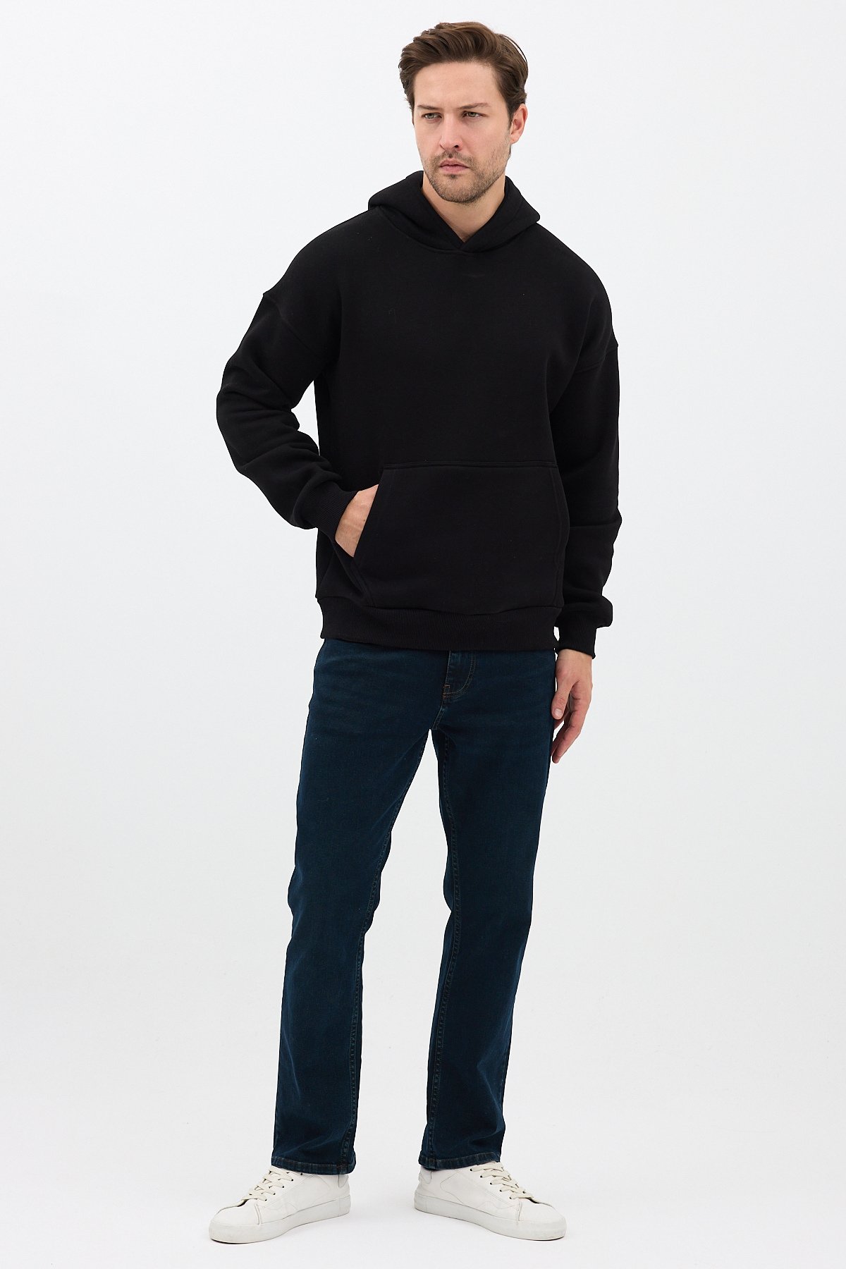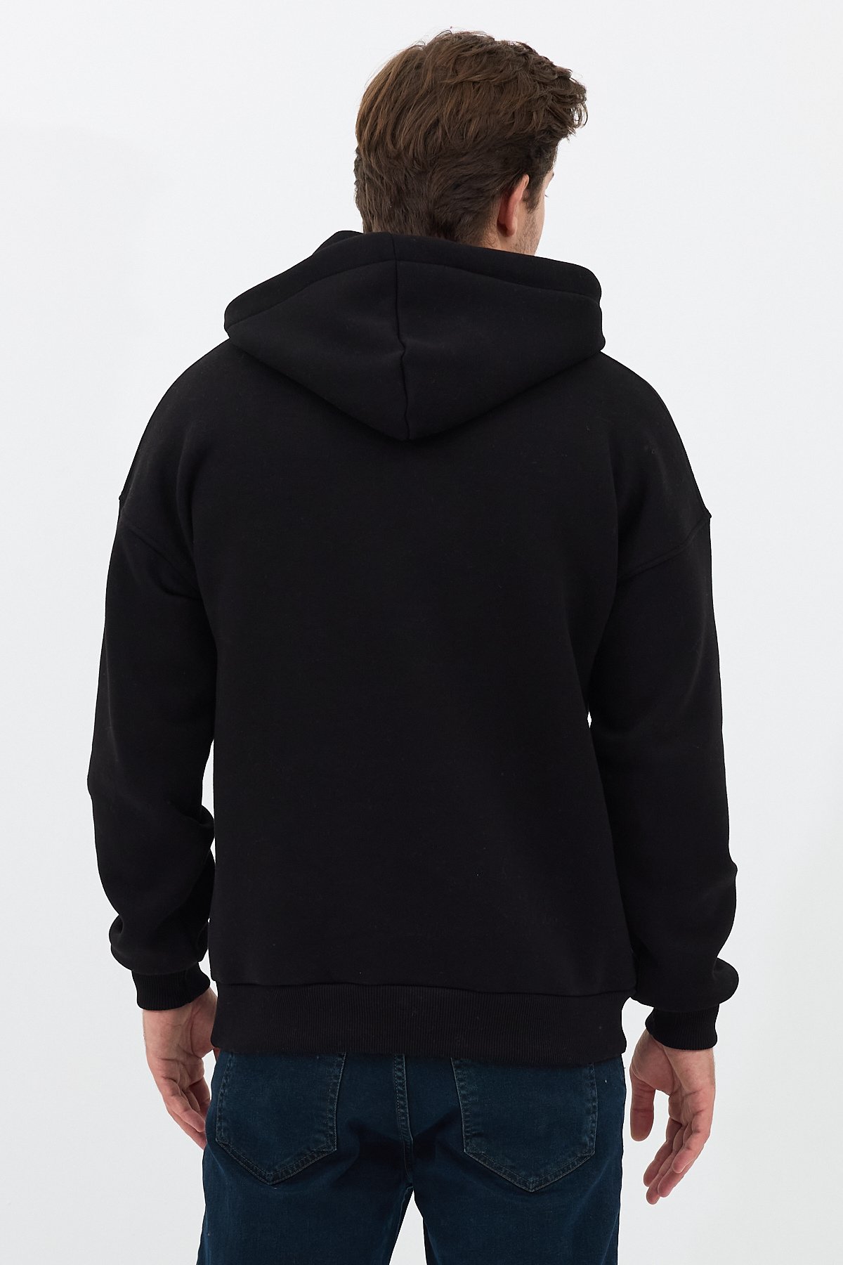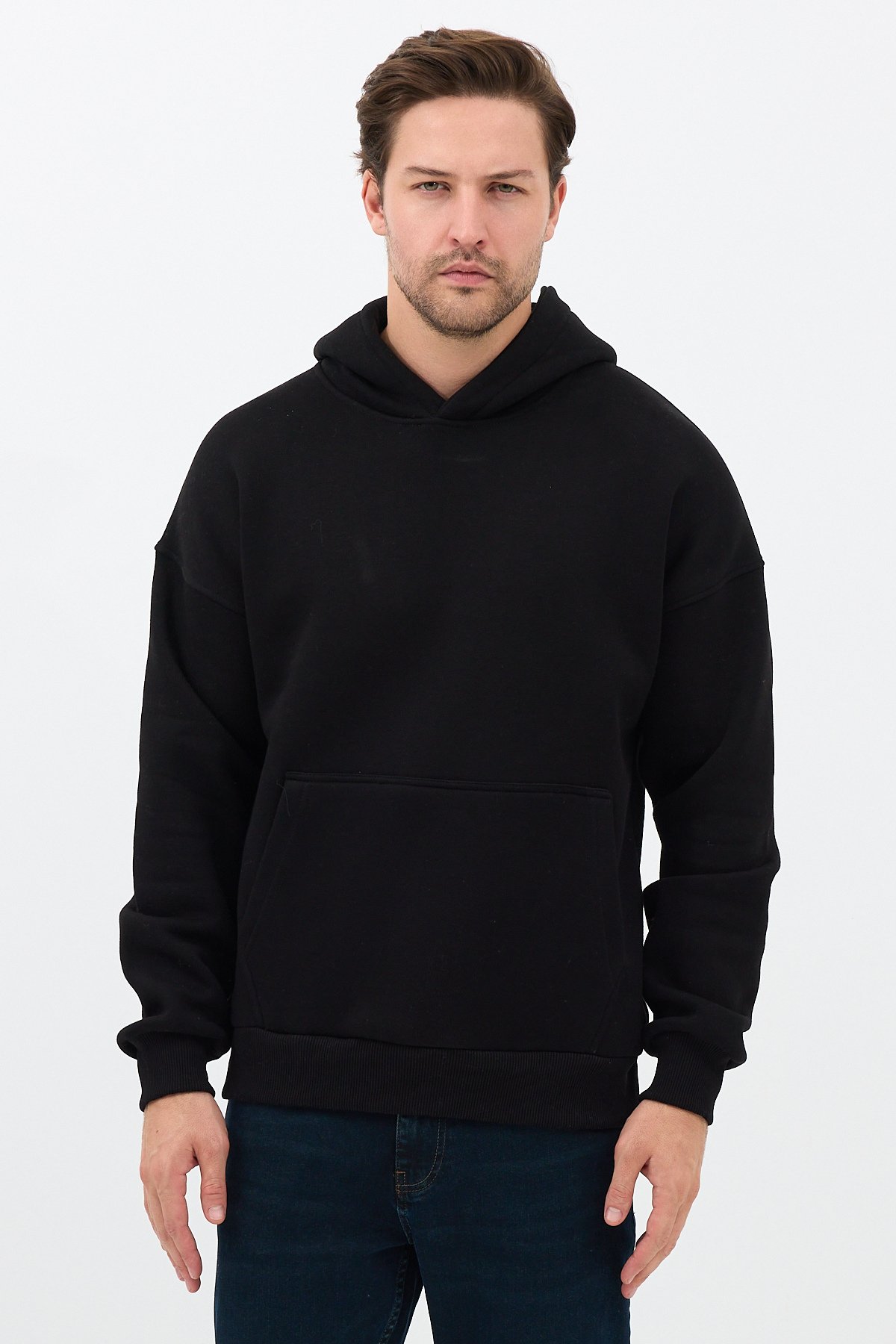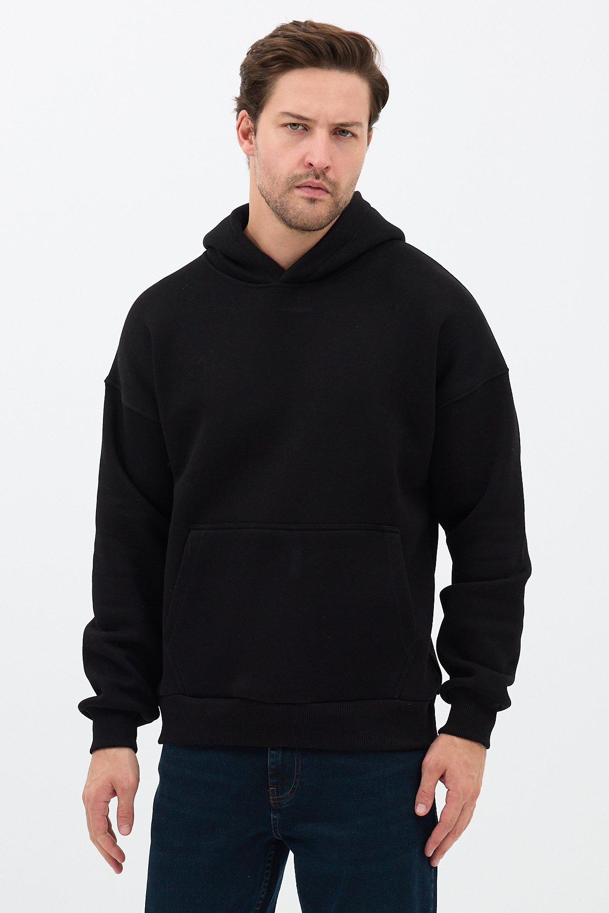Erkek Oversize Pamuklu Kanguru Cepli 3 İplik Basic Kapüşonlu Sweatshirt Siyah - M