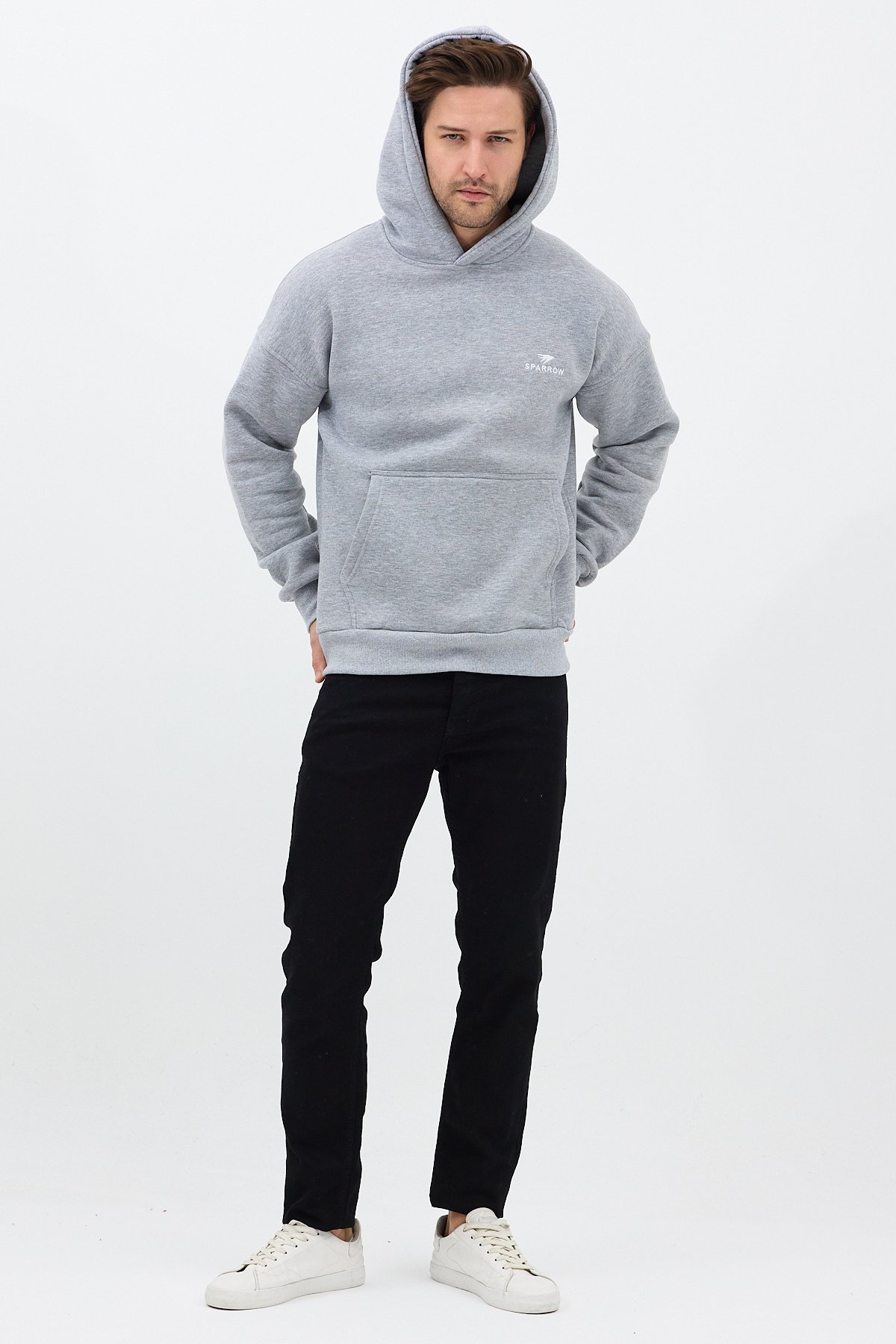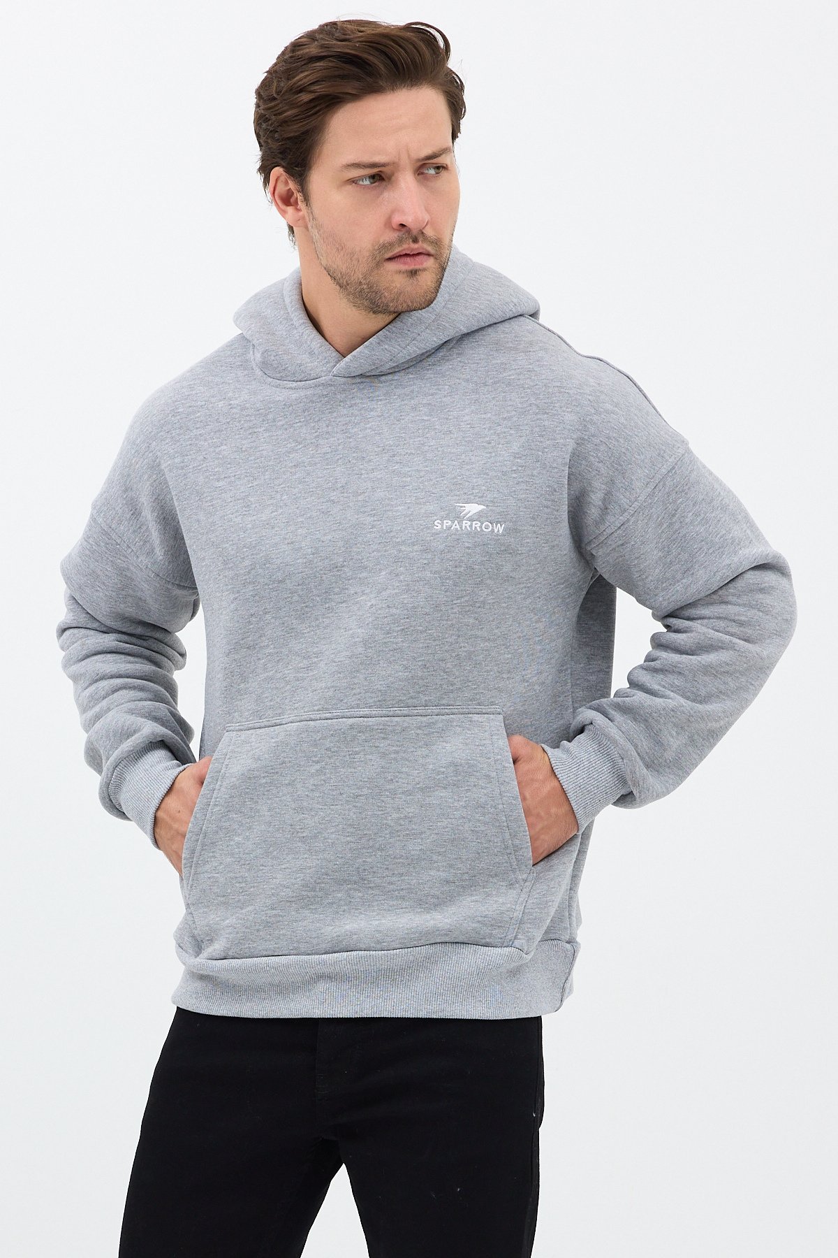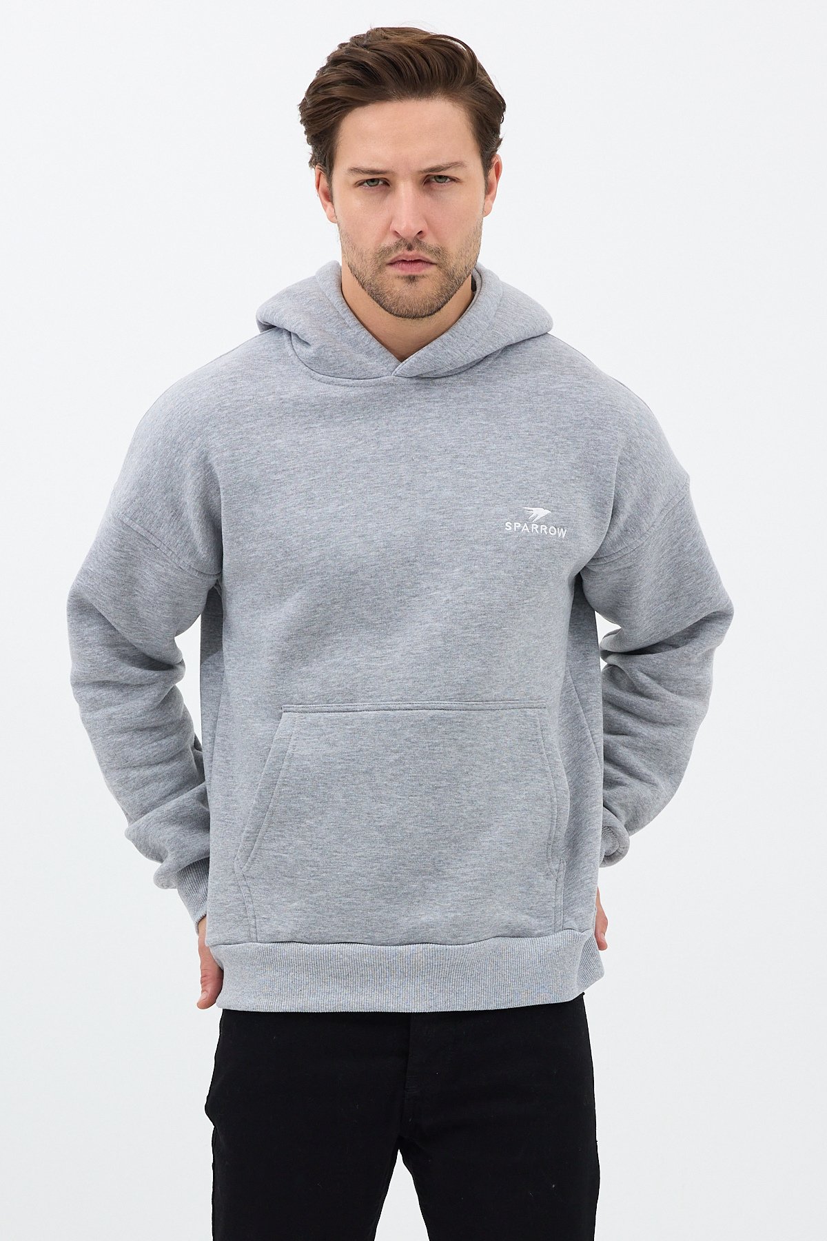 Erkek Oversize Pamuklu Kanguru Cepli Basic 3 İplik Nakışlı Kapüşonlu Sweatshirt Gri - XL SPRW-KN-GRI-XL