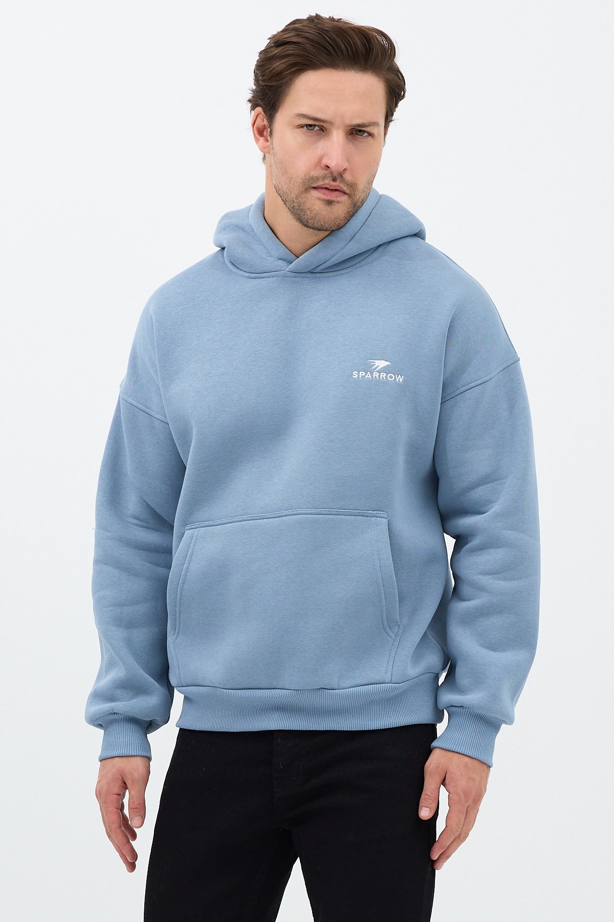 Erkek Oversize Pamuklu Kanguru Cepli Basic 3 İplik Nakışlı Kapüşonlu Sweatshirt Mavi - M SPRW-KN-MAVI-M
