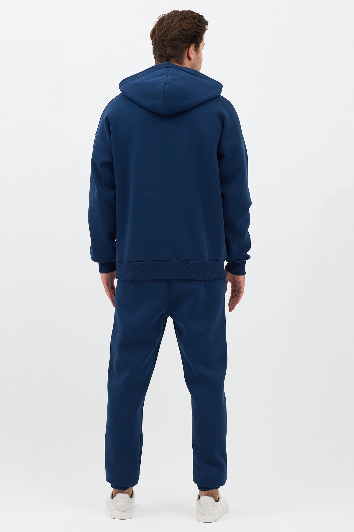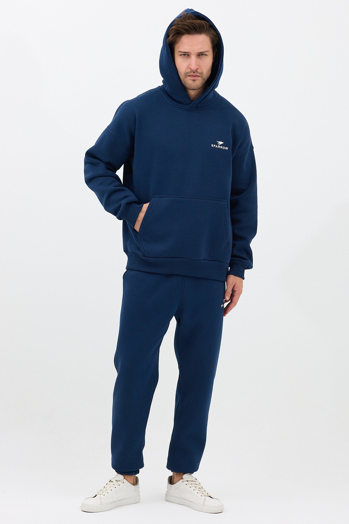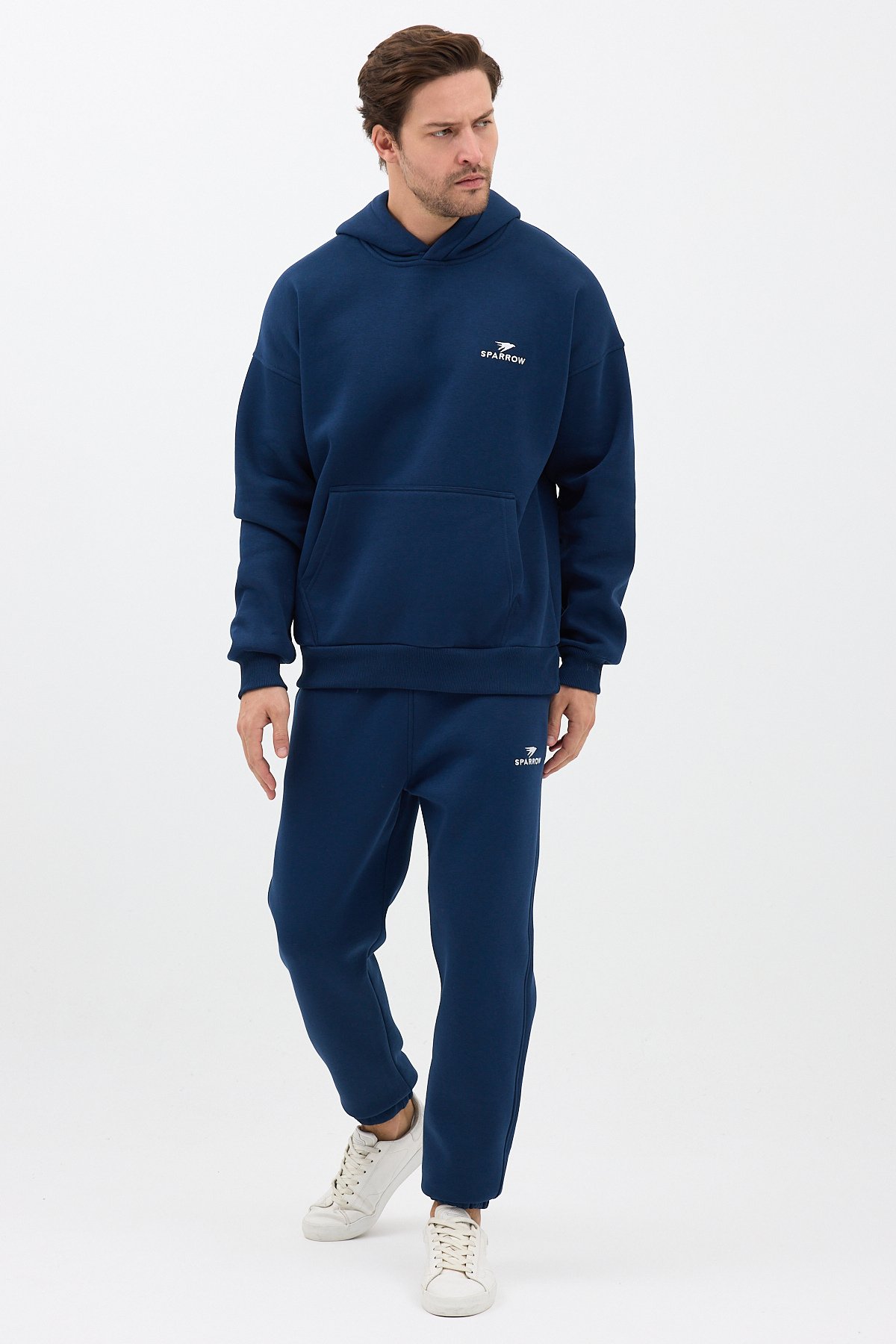 Erkek Pamuklu Nakışlı Oversize Kapüşonlu 3 İplik Kanguru Cepli Basic Eşofman Takımı Lacivert - 2XL SPRW-KN-TK-INDIGO-2XL