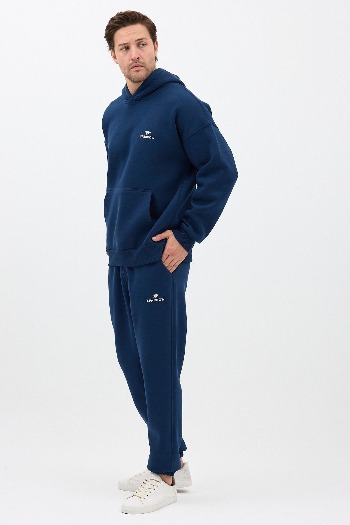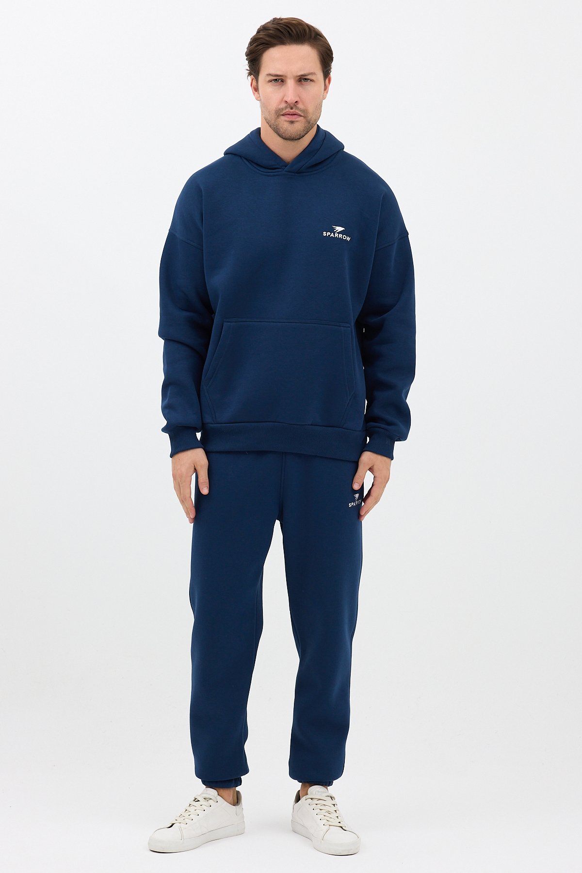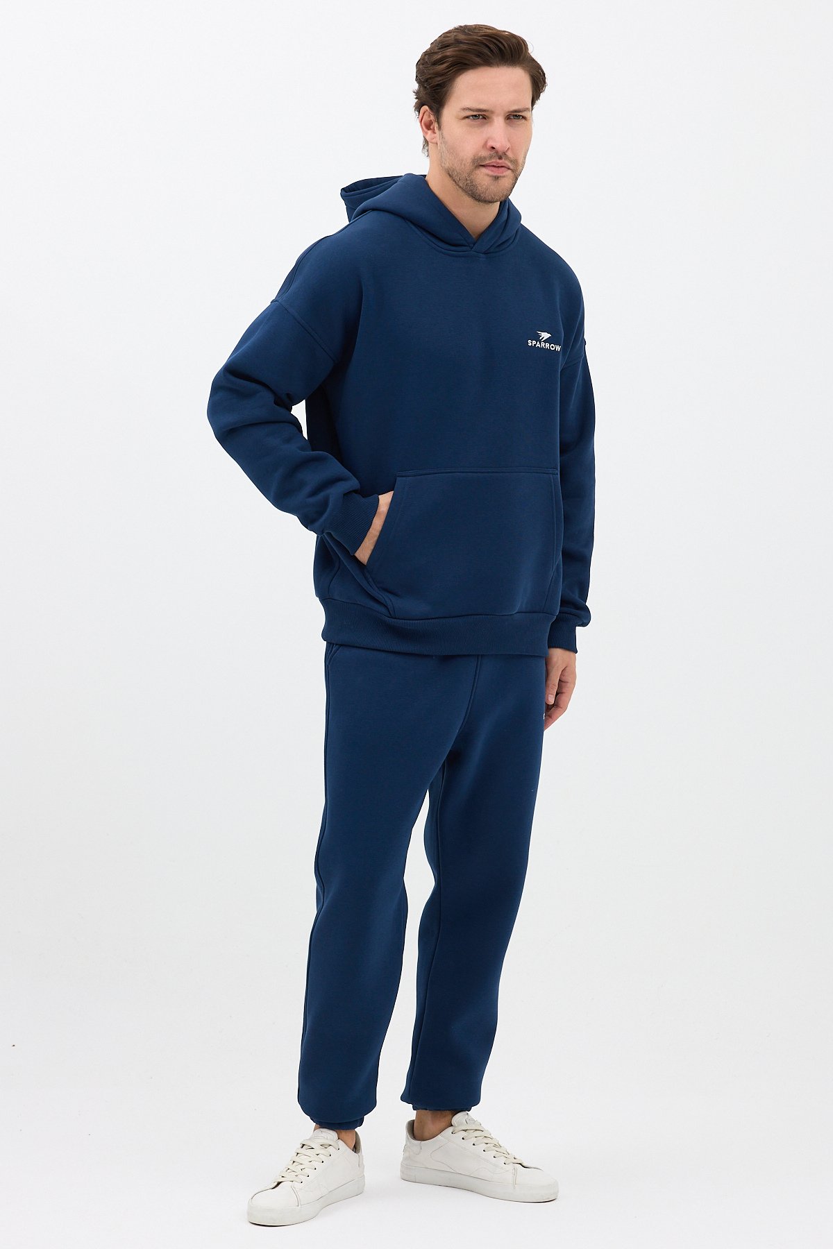 Erkek Pamuklu Nakışlı Oversize Kapüşonlu 3 İplik Kanguru Cepli Basic Eşofman Takımı Lacivert - 2XL SPRW-KN-TK-INDIGO-2XL