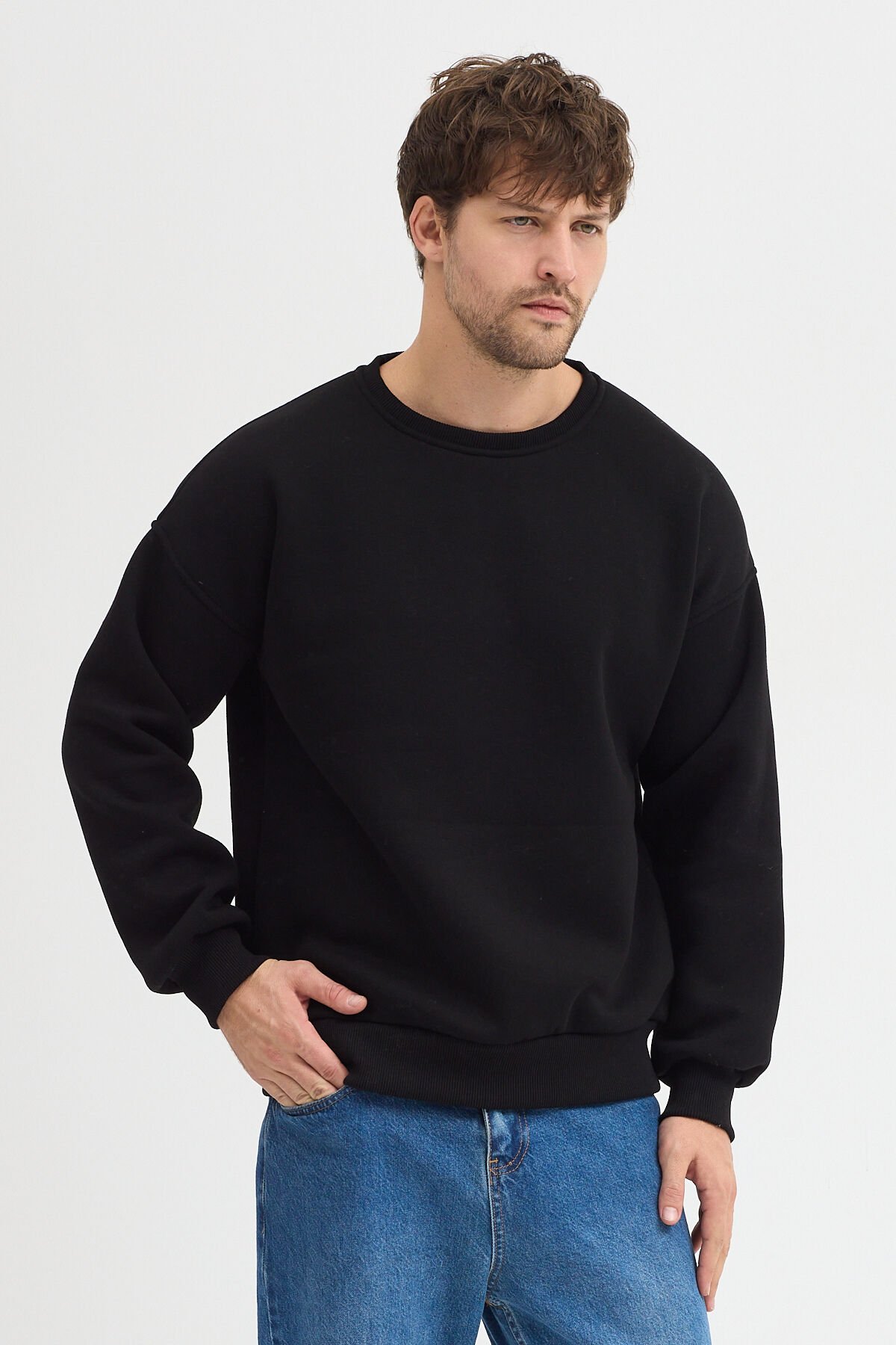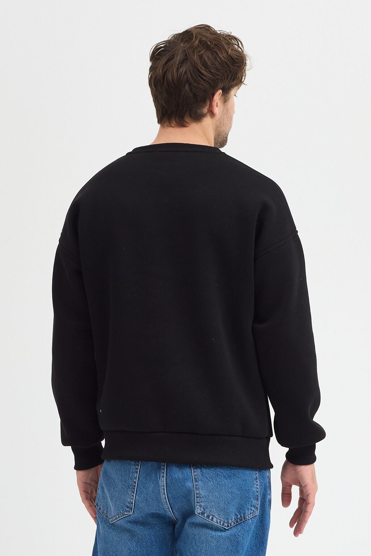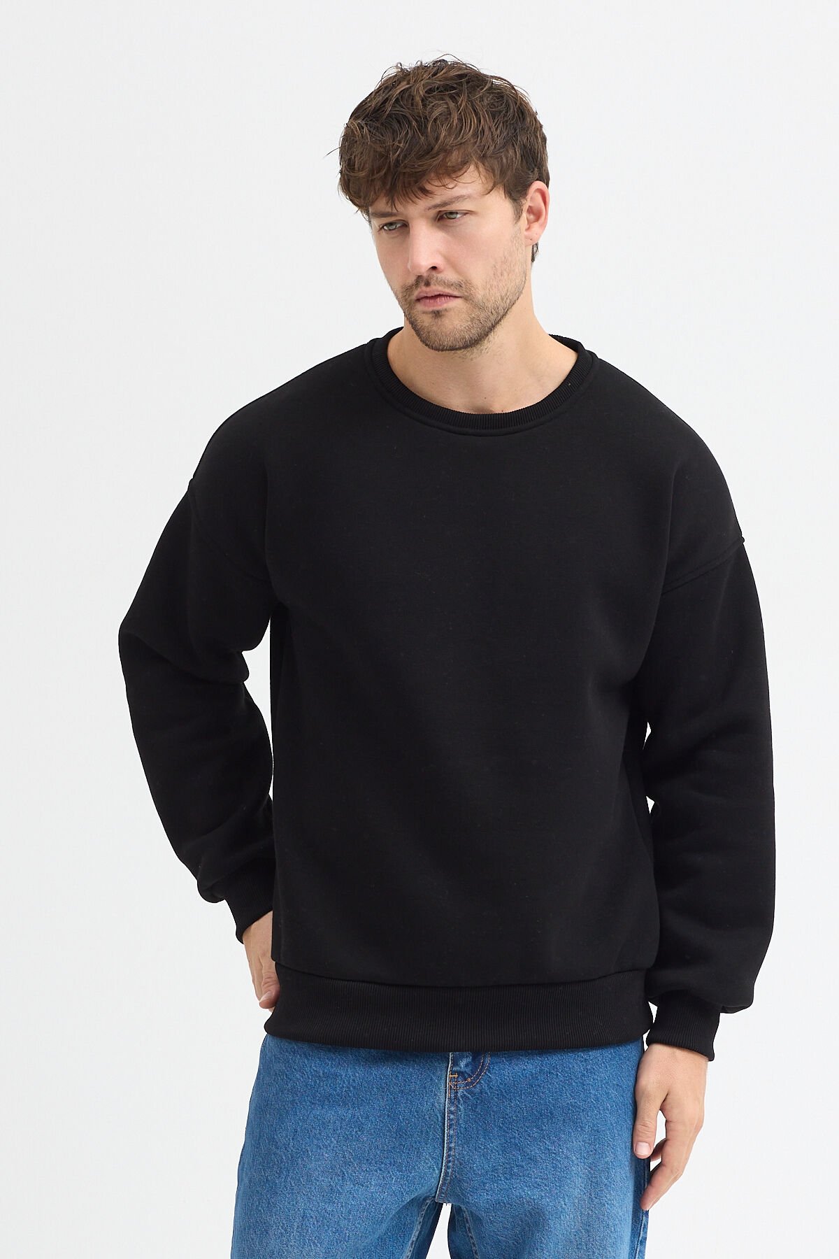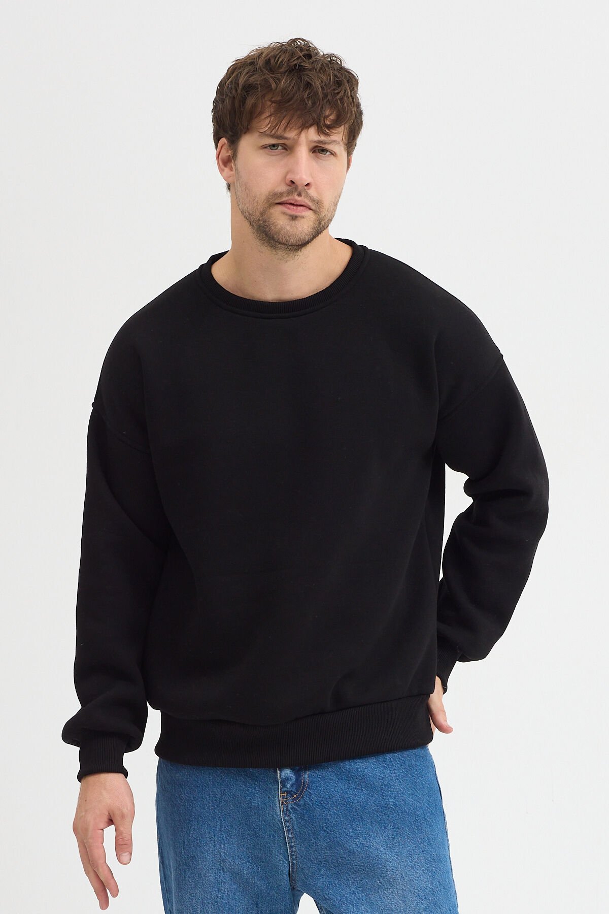 Bisiklet Yaka Erkek Oversize Sweatshirt Pamuklu Basic 3 İplik Şardonlu Siyah - XL
