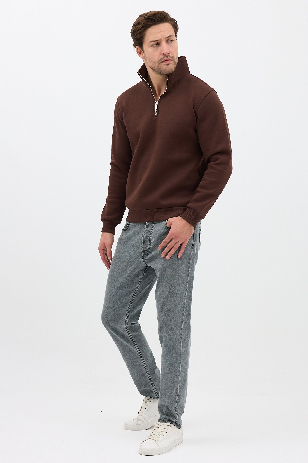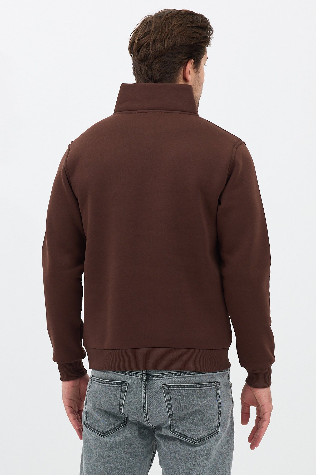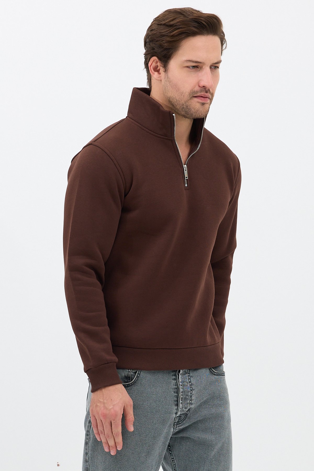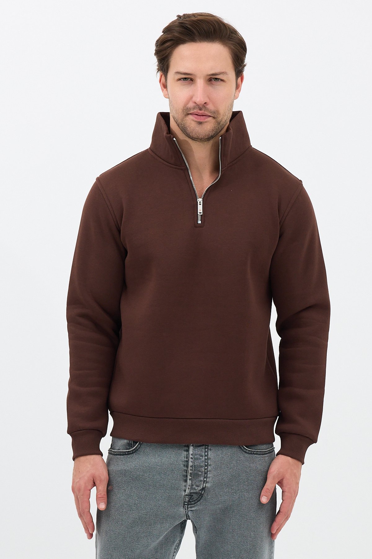 Unisex Regular Fit Pamuklu Dik Yaka Yarım Fermuarlı Sweatshirt Kahverengi - L SPRW-YF-KAHVE-L